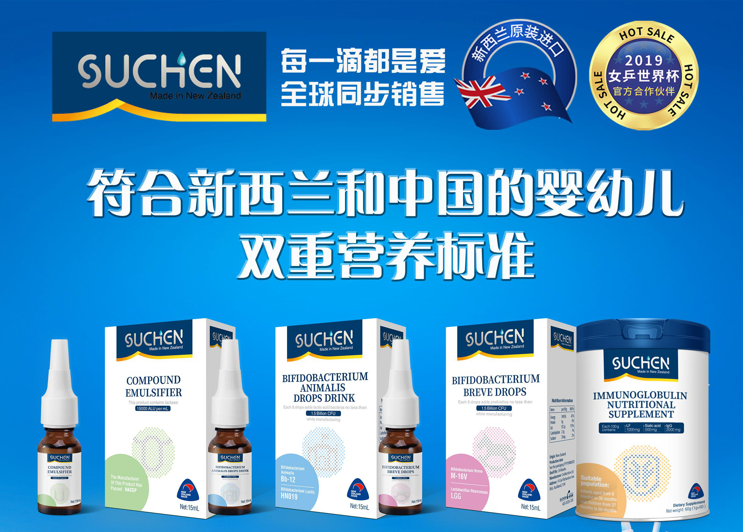 SUCHEN素臣以“源于愛.傳遞健康”為使命,秉承“健康、穩(wěn)定、持續(xù)” 的發(fā)展理念,以“健康+營養(yǎng)”的產(chǎn)品理念,專注研發(fā)嬰童營養(yǎng)補(bǔ)充品,致力于提供好的營養(yǎng)方案。并且嚴(yán)格按照新西蘭和中國衛(wèi)生部幼兒營養(yǎng)補(bǔ)充劑雙重標(biāo)準(zhǔn)生產(chǎn),也是目前行業(yè)內(nèi)贊助過國際乒聯(lián)女子乒乓球世界杯全球賽事品牌,2019女乒世界杯官方合作伙伴,有眾多體育明星傾情推薦。