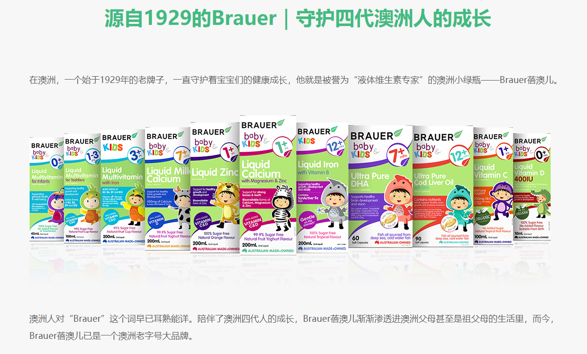 - 品牌特色:BRAUER蓓澳兒始于1929年,BRAUER家庭把工廠建在美麗純凈的巴羅莎山谷(BAROSSA VALLEY),致力于為澳大利亞人提供高品質(zhì)的健康產(chǎn)品,現(xiàn)在已成為深受澳洲媽媽信賴的母嬰營(yíng)養(yǎng)食品品牌。蓓澳兒Brauer擁有兒童成長(zhǎng)全系列液體營(yíng)養(yǎng)產(chǎn)品“小綠瓶系列”等,如今加入了輔食產(chǎn)品線。