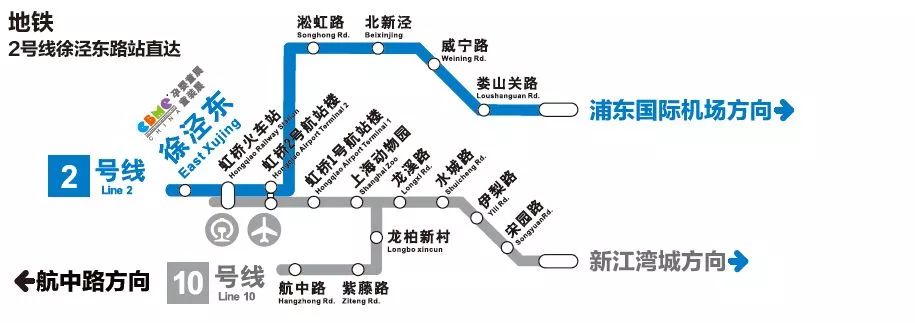 - 浦東國際機場站:會展中心-地鐵2號線東延伸段(廣蘭路方向),在廣蘭路站下車再乘坐地鐵2號線(徐涇東方向),在徐涇東站下車