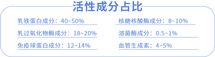 該專利成分采用急速凍干工藝萃取技術,成功地從新西蘭新鮮奶源中,按照其天然的比例,保證每一個蛋白活性的更大化,一次性提純超過58種生物活性蛋白共同聯(lián)合協(xié)作。主要營養(yǎng)成分:乳鐵蛋白,乳過氧化物酶,免疫球蛋白,溶菌酶,血管生成素,核糖核酸酶。