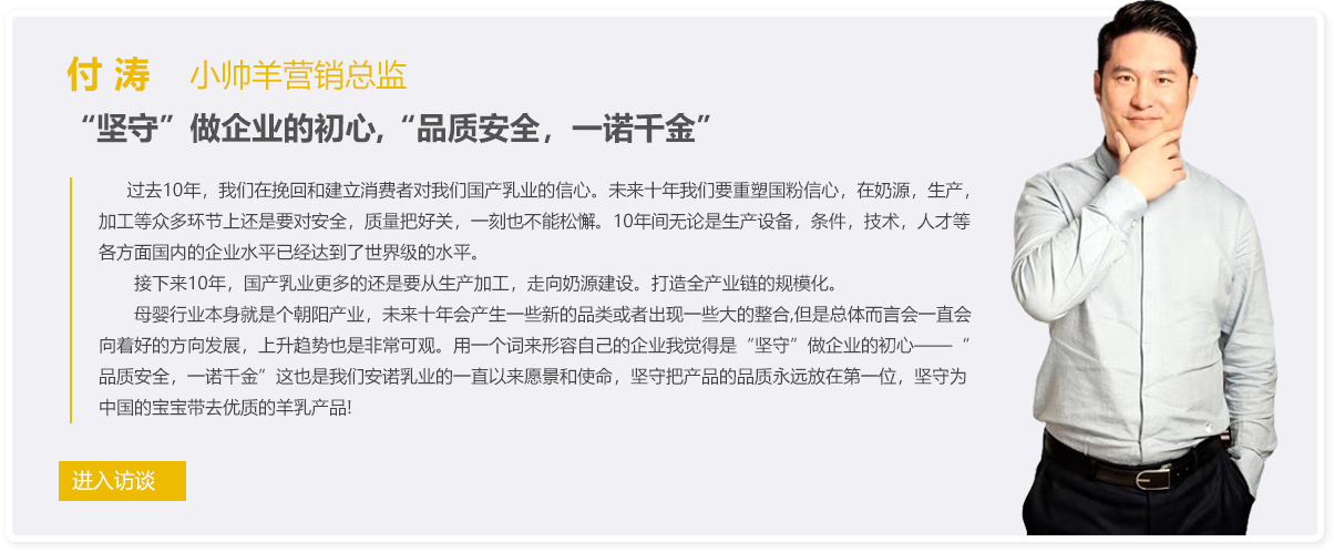 我參觀過安諾乳業(yè)的生產(chǎn)工廠,小帥羊的全產(chǎn)業(yè)鏈布局確保了每一罐產(chǎn)品的品質(zhì)和安全,始終是我們店羊奶粉品牌中銷售業(yè)績的前幾名,成為我們店的主推品牌。店里的老顧客忠誠度很高,甚至?xí)没顒映上滟徺I,還經(jīng)常有顧客過節(jié)回家要求把奶粉快遞到家里。
